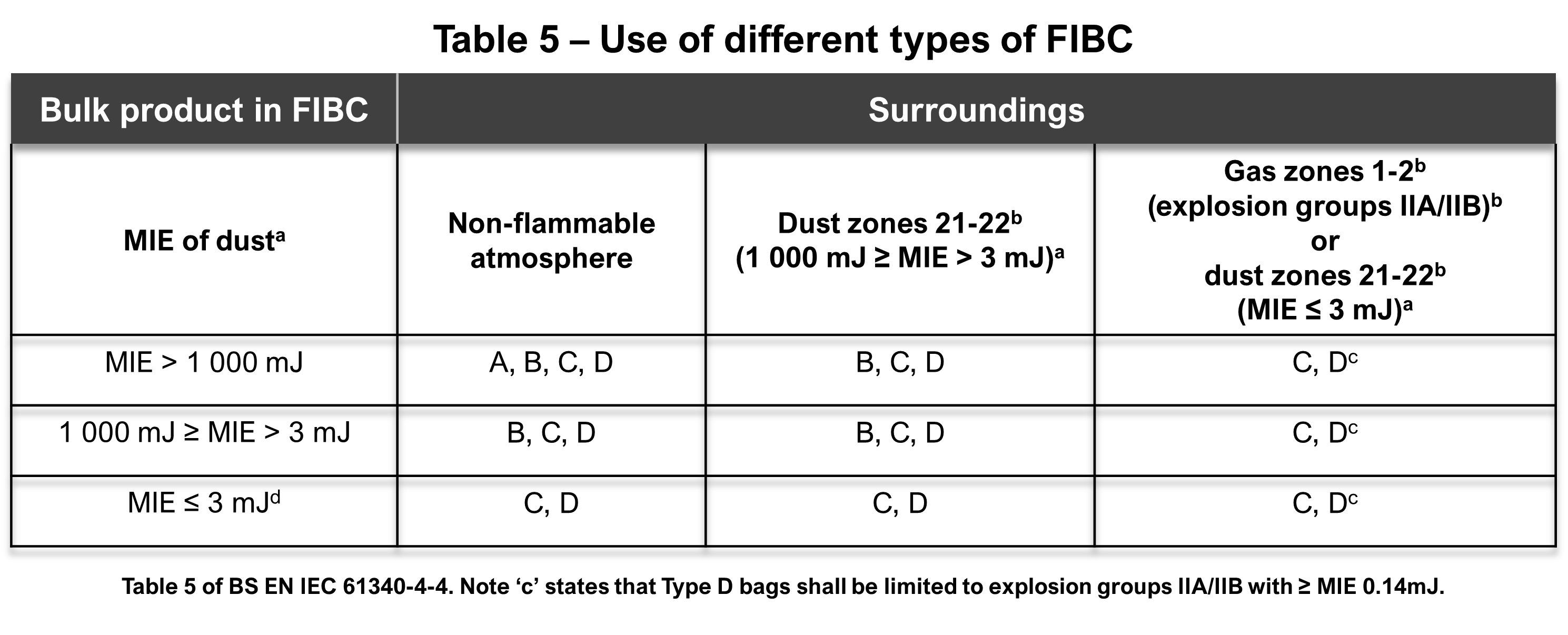 Restrictions around the usage of different bag types in Ex atmospheres is summarised in Table 5 of Clause 5, “Safe use of FIBC”