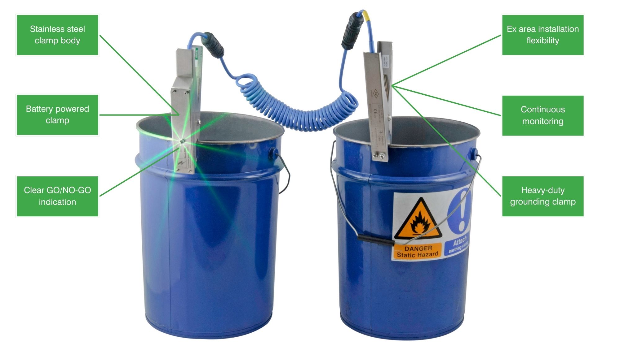 - The monitoring circuit and LED indicator are housed in a stainless steel clamp body that consists of a high-strength torsion spring and a pair of tungsten carbide teeth designed to bite through layers of deposits like rust, paints, and product deposits that could impede the transfer of electrostatic charges.