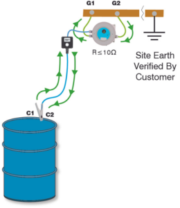The connection to the general mass of earth can be achieved through the site’s electrical earthing and lightning protection circuits. Many sites also use dedicated, permanently installed earth rods to provide a static dissipation path to earth.
