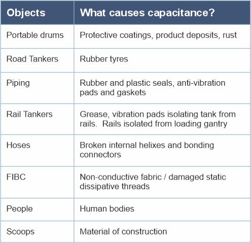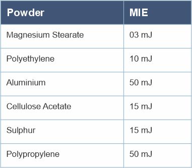 Tables 2a and 2b detail MIE of some common liquids and powders used in process industries. If an object becomes isolated and the static voltage increases on it then the charge on the object can quickly achieve a value above the product MIE and therefore be capable of igniting these flammable materials.